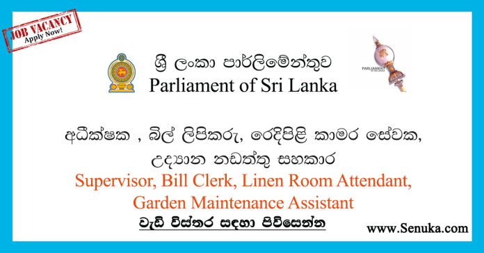 Supervisor, Bill Clerk, Linen Room Attendant, Garden Maintenance Assistant – Parliament of Sri Lanka
